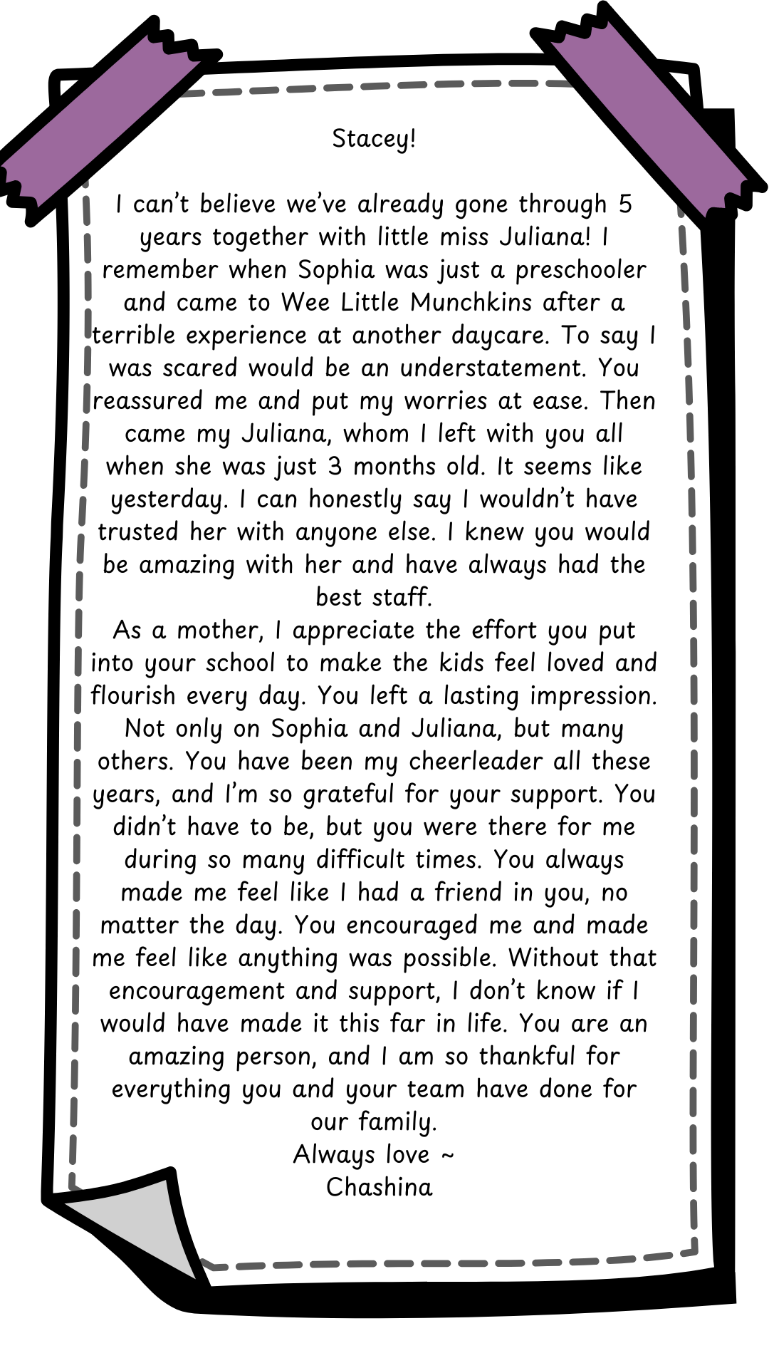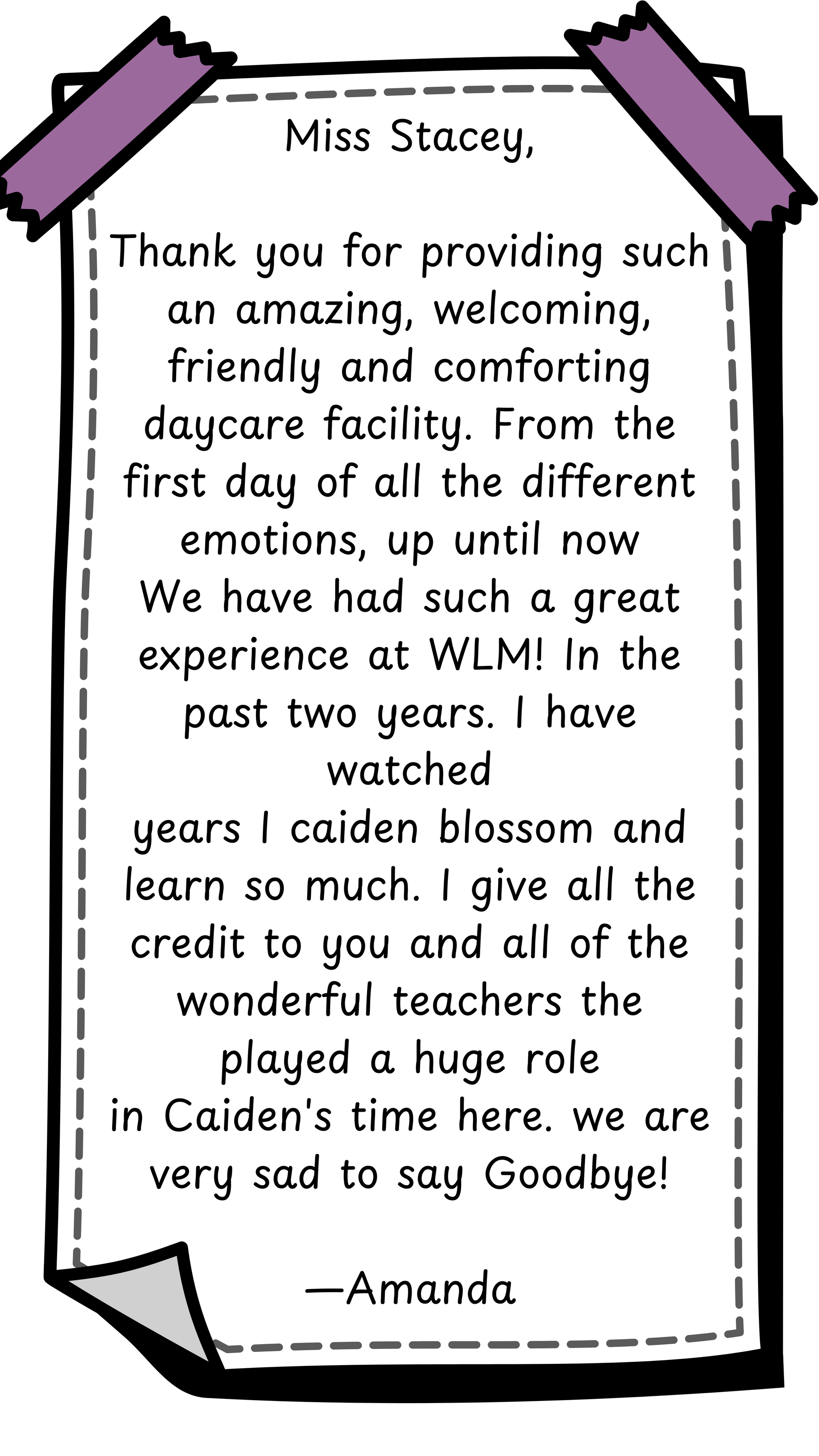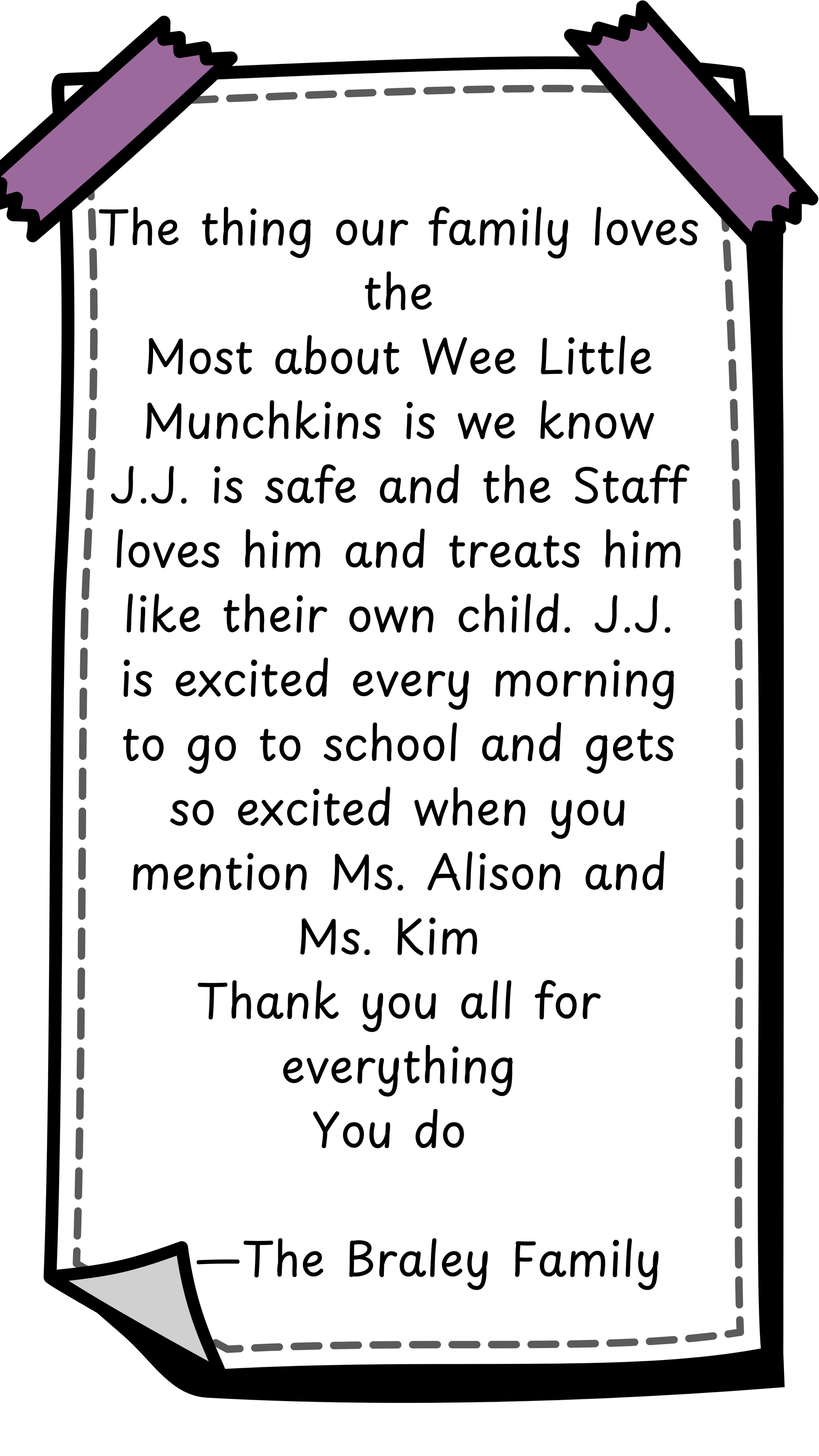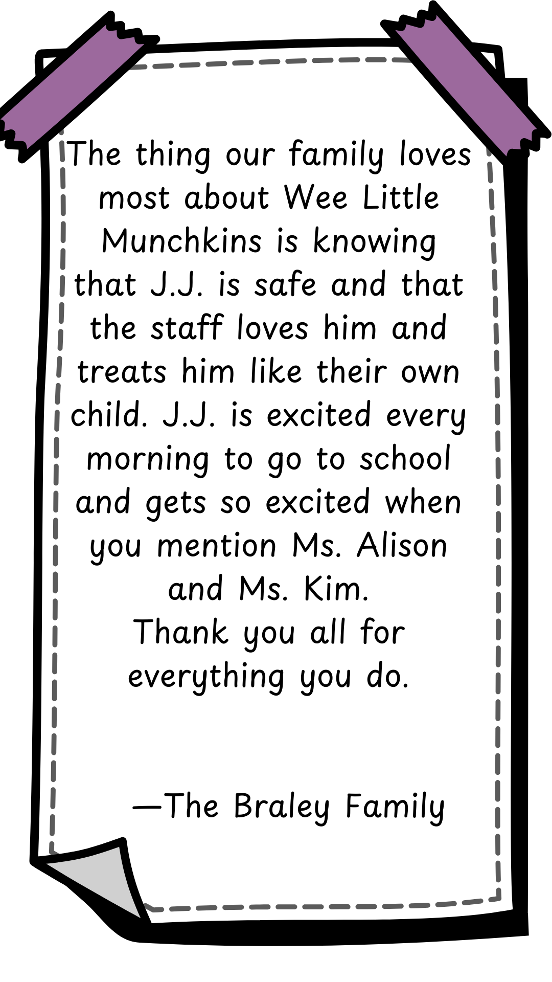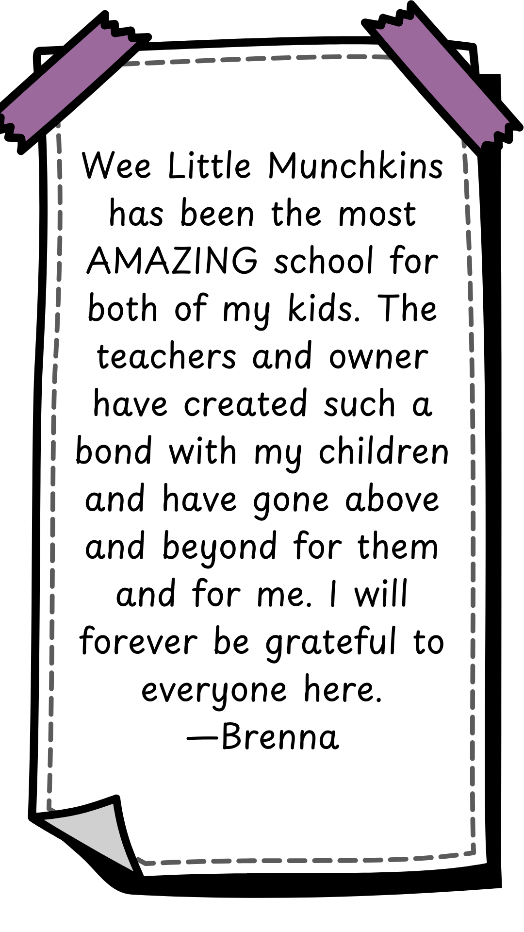 At Wee Little Munchkins, we understand that children thrive when they have a healthy balance of active play, opportunities for self-expression, and quiet moments. Our weekly curriculum includes themed projects designed to engage children's curiosity and creativity, making learning fun. With daily reports provided to parents/guardians, you'll always be aware of how your child is doing. Plus, our program operates year-round, offering both full-time and part-time schedules to accommodate your needs. Trust us to provide a nurturing environment tailored to your child's age and developmental stage. Contact us today to find out more and enroll your child!