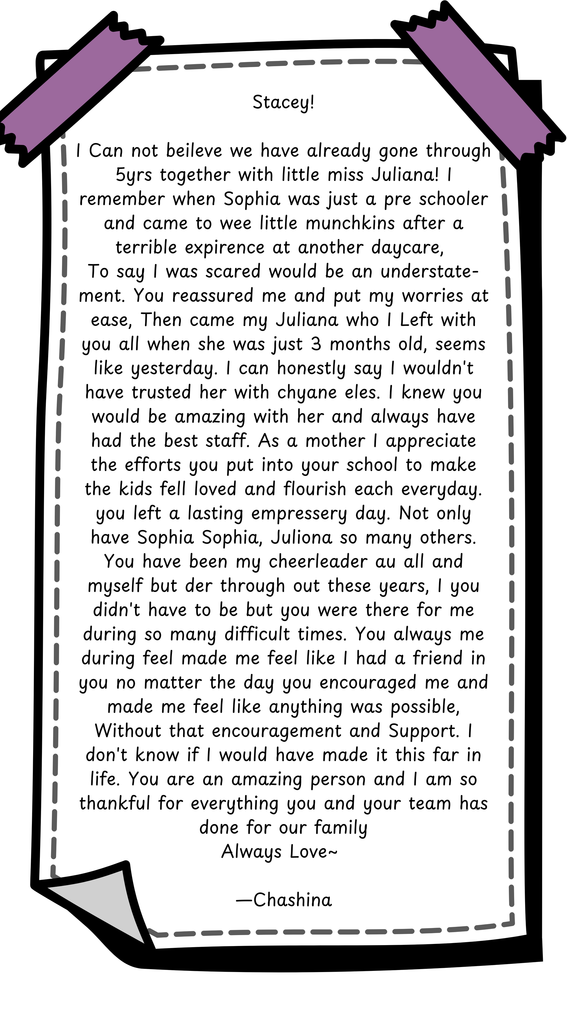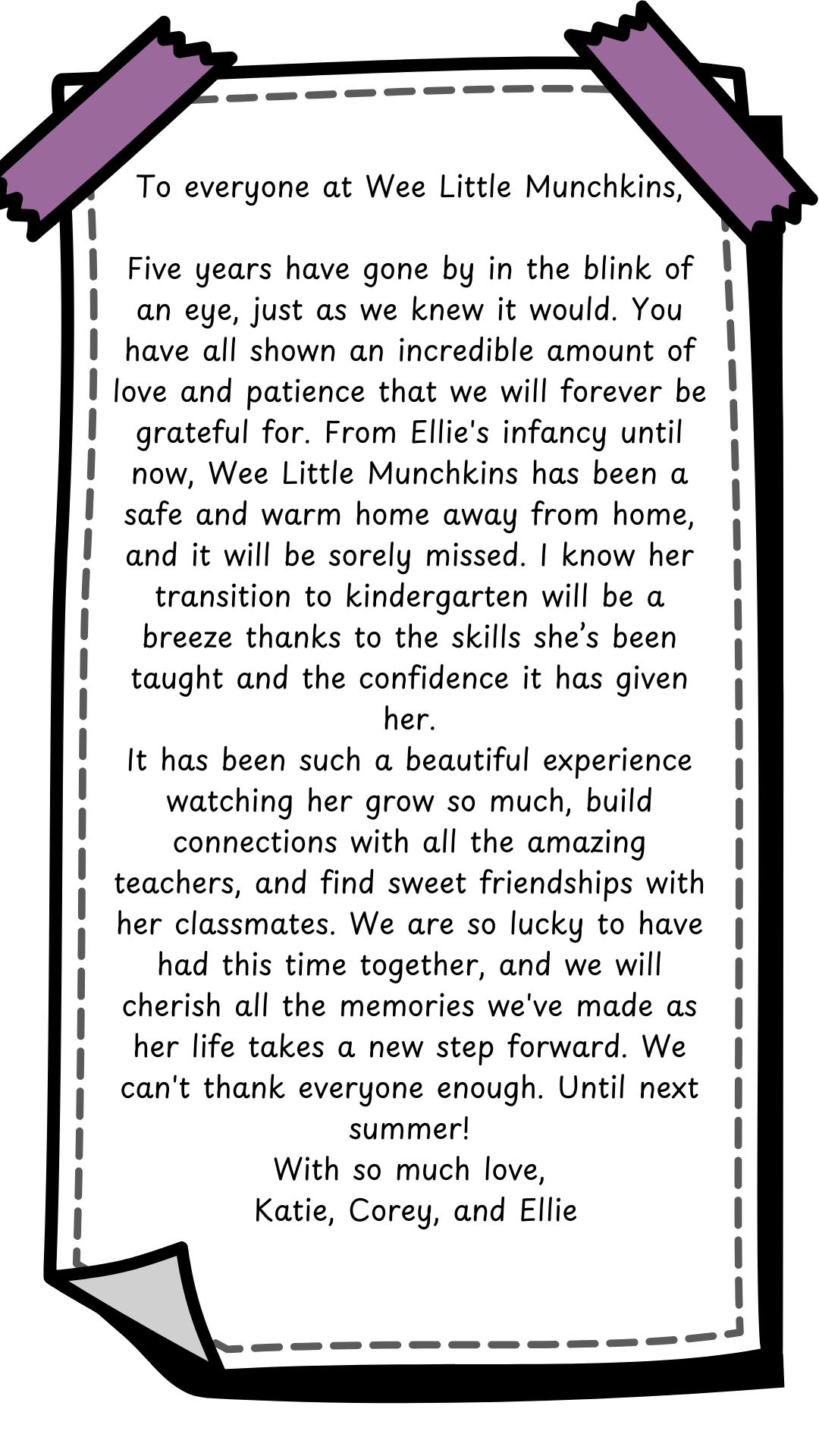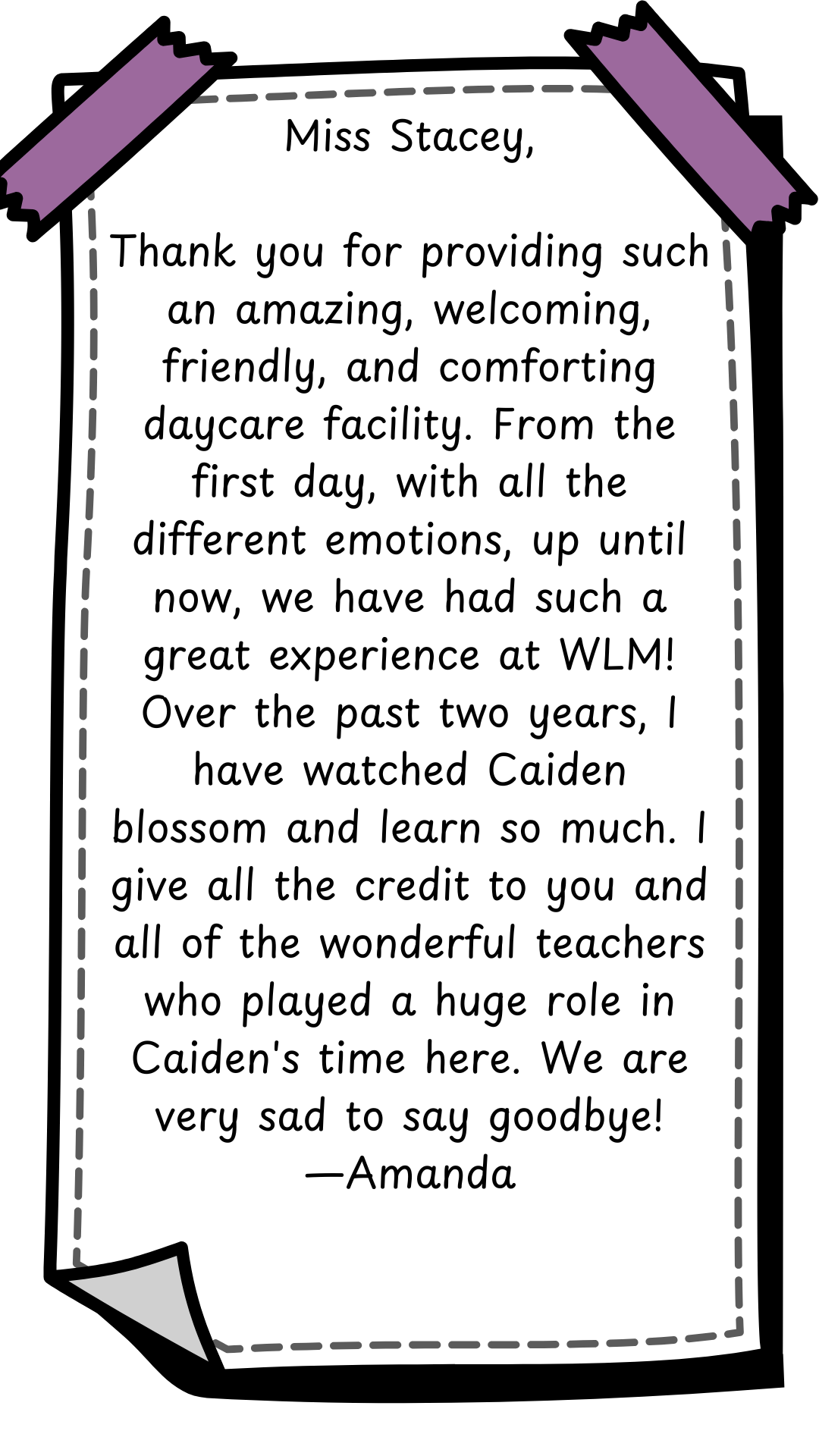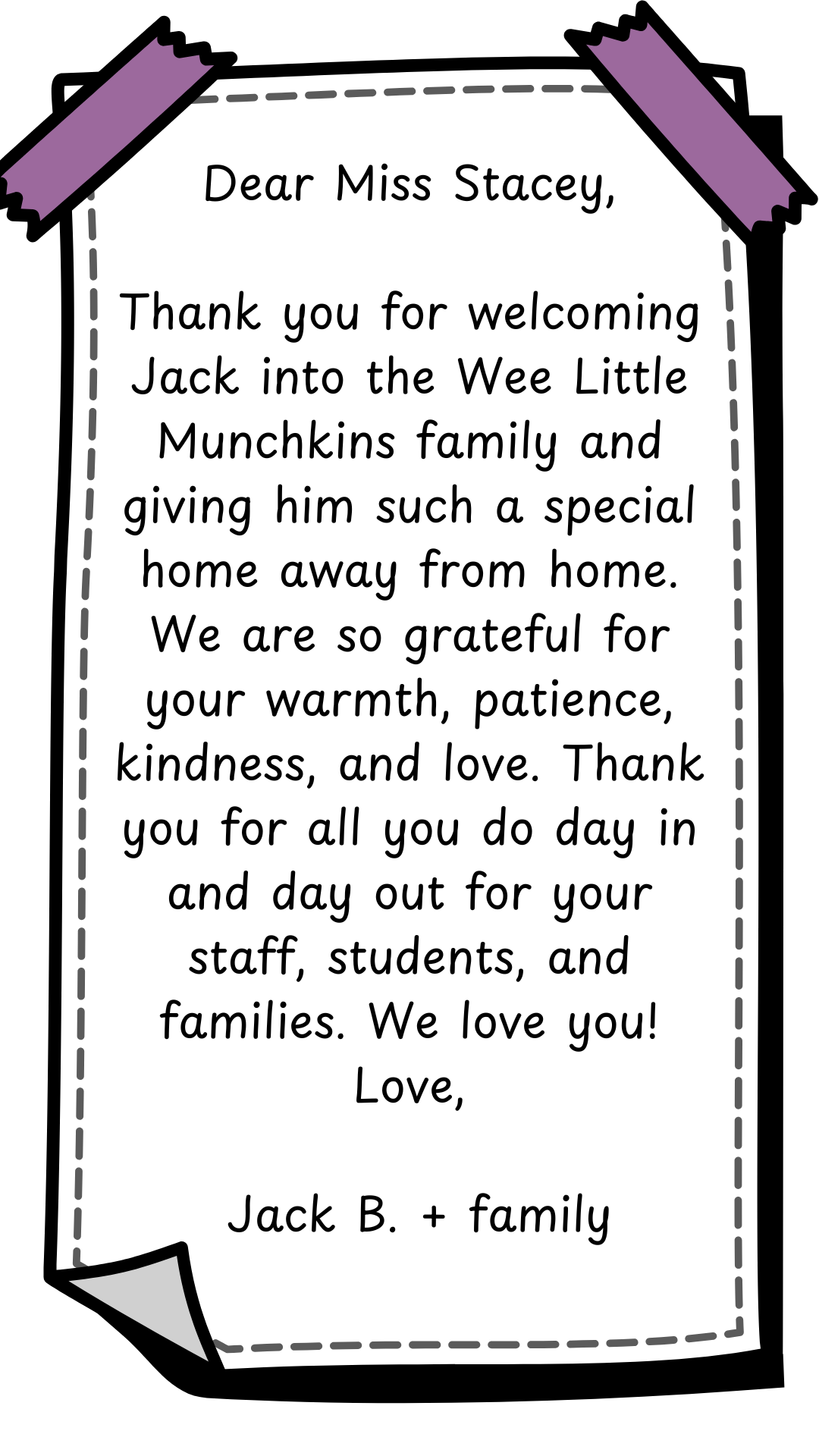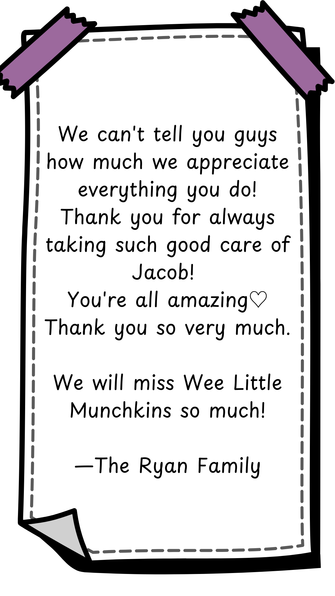 At Wee Little Munchkins, we understand that children thrive when they have a healthy balance of active play, opportunities for self-expression, and quiet moments. Our weekly curriculum includes themed projects designed to engage children's curiosity and creativity, making learning fun. With daily reports provided to parents/guardians, you'll always be aware of how your child is doing. Plus, our program operates year-round, offering both full-time and part-time schedules to accommodate your needs. Trust us to provide a nurturing environment tailored to your child's age and developmental stage. Contact us today to find out more and enroll your child!